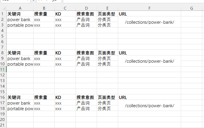 这个表格的思路便是将你要布局的关键词,将它放到对应的页面里。
