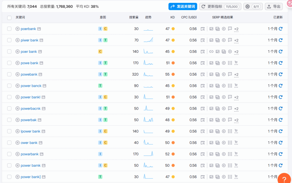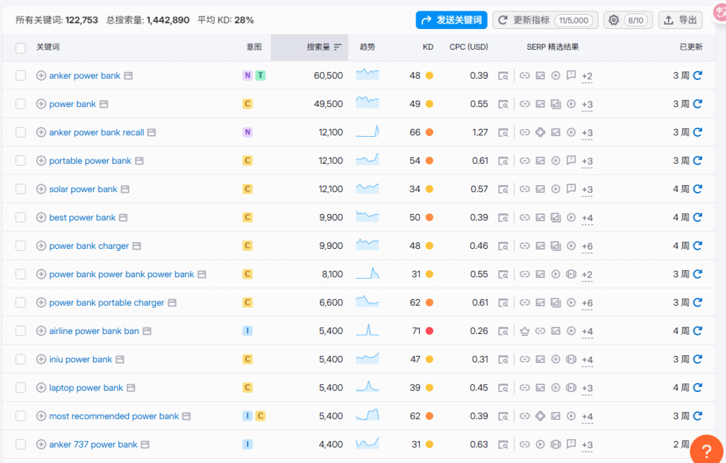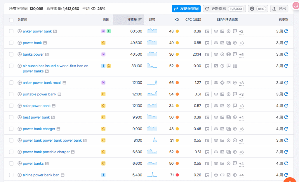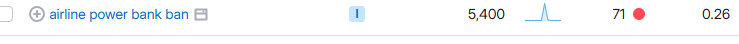 保留Trend的原因是,Semrush不知是什么原因,会有一些异常的词,而且常常是一些长尾词,甚至是拼错的长尾词,按理说不会有多高的搜索量,但是它会突然有一个特别高的搜索量,然后归零。这些词我测试过,并且排名到第一(是因为实际上没有人竞争也没有人搜),这个搜索量是虚假的,GSC里的曝光量也是寥寥无几。比如这个(仅示意,这个词应该是正常的,因为前一段时间中国航班对充电宝开始有3C要求)