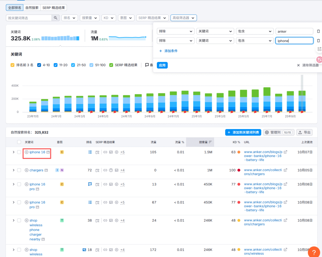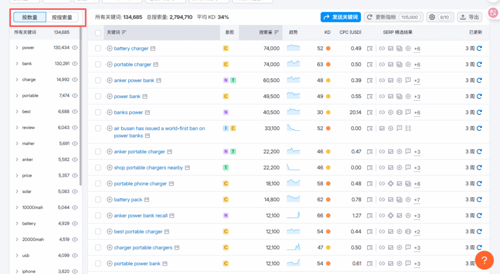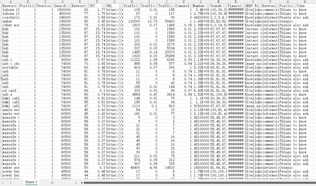 2. 在关键词列表中,导出他们的关键词。由于Anker获得的关键词排名很多,因此排除掉一些可能不需要的关键词,比如品牌词anker,以及iphone这些词。由于这里导出是按搜索量往下排序的,所以我们也按照搜索量去排序,去看一下哪些词是不需要的。