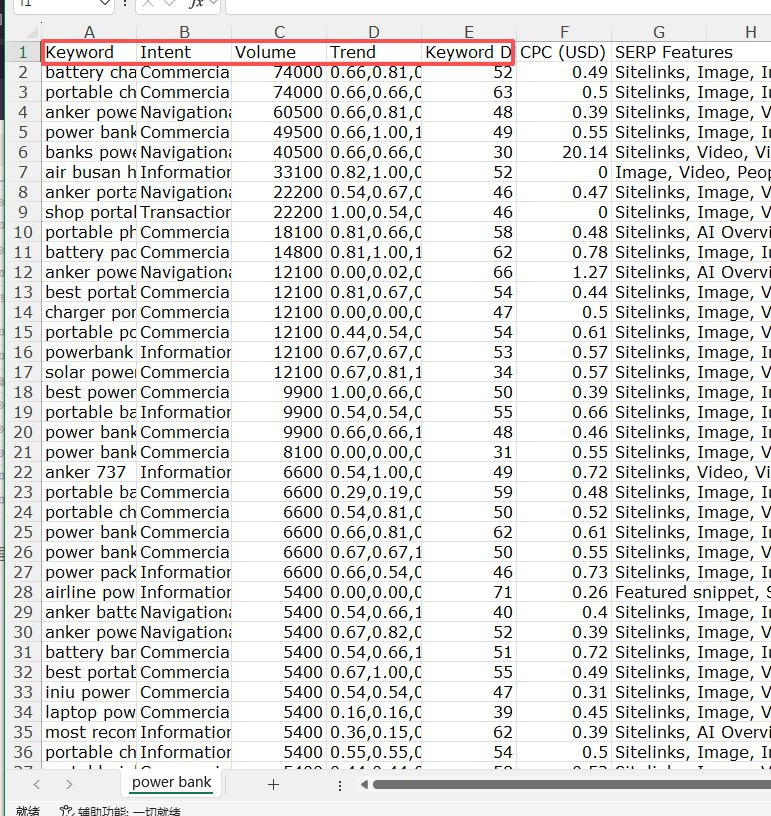 4. 更换词根,不断重复以上步骤。最后将表格放到一个表里,按搜索量排序,随后去重,并删除不需要的列。在这里,我会保存以下几列,并且按这个顺序去列:关键词、搜索量、关键词、搜索意图(删掉原有的)、Trend。将这个excel文件命名为原始词表,下面的工作表命名为Semrush。