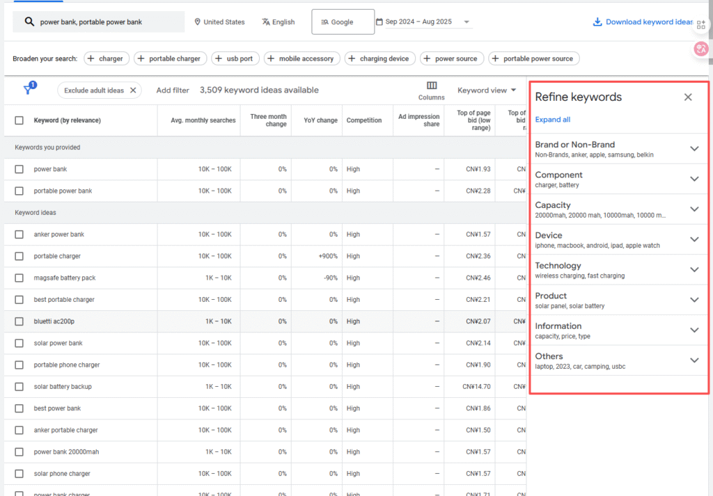 - 完全匹配:和你所给的关键词相同,或按照你所给的关键词以及词序去匹配关键词。比如power bank, 会匹配到,power bank, (A) power bank, power bank (B), (A) power bank (B)
