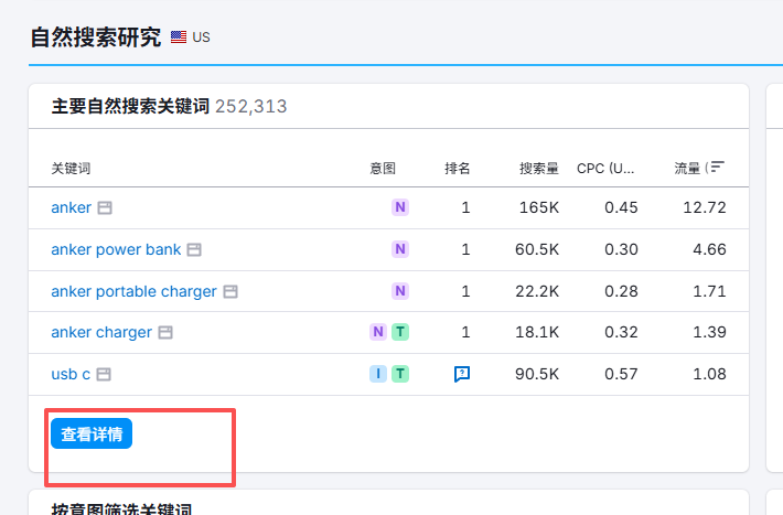 1. 相信你已经有了一些竞对的网站。没有也没有关系,把词根放到谷歌里搜索,把靠前的,产品是同类目的网站记下来,随后放到SEMrush上去查看即可。比如我搜索power bank,在美国地区排名第一的是Anker。那么就在SEMrush中打上他们的网址。随后滚动到下方,找到这一栏,点击详情。