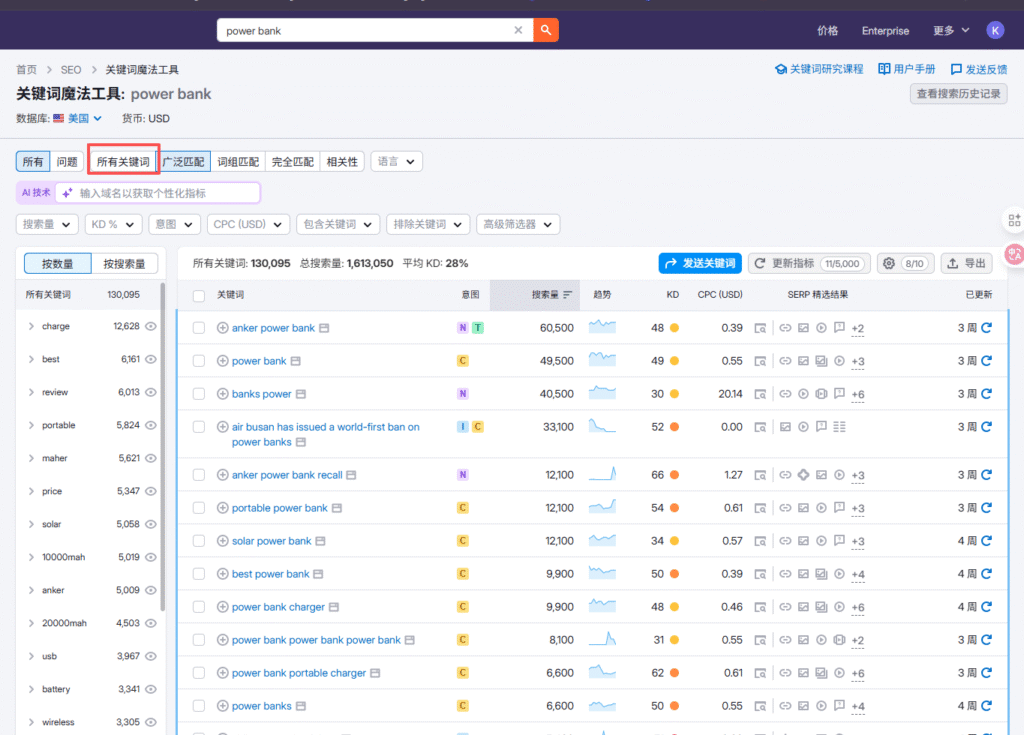 • 广泛匹配:按照你所给的关键词和变体(不同时态或单复数),或打乱词序去匹配关键词,也就是比词组匹配多了一组匹配变体的词。比如power bank,会额外匹配到power banks, banks power……..(如果是动词,则可能会匹配到过去时,现在时,动名词等)
